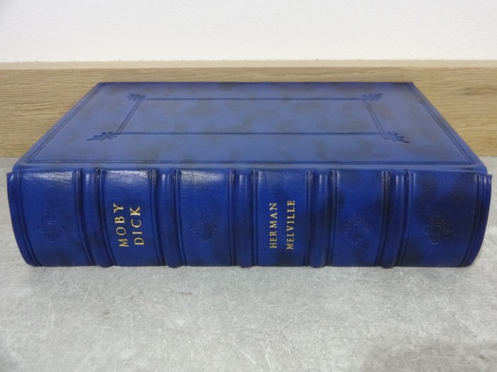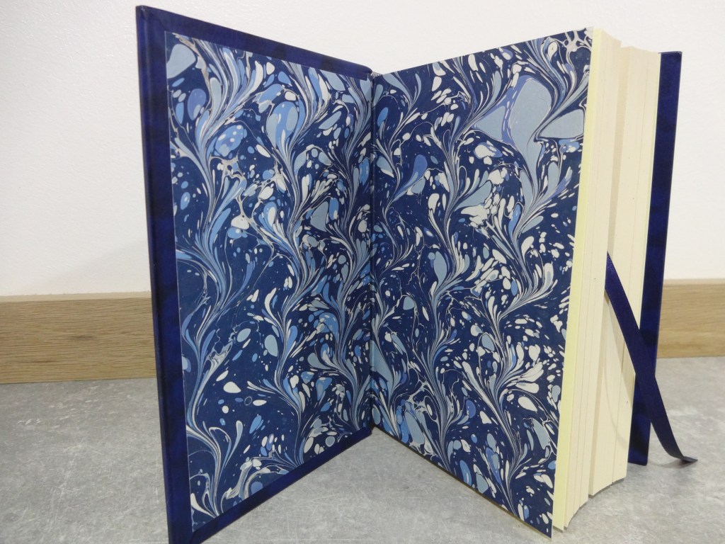 The book has been resewn and rebound in full antiquated calfskin leather with raised bands and handmade marbled endpapers. The calfskin has been dyed to depict the murky ocean depths.
