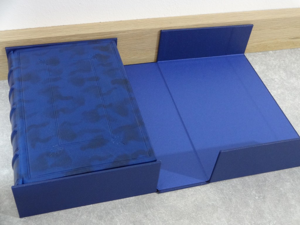 The book has silk cane headbands and silk marker ribbon; blind tooling throughout with gold title and author; and a unique clamshell custom slipcase.